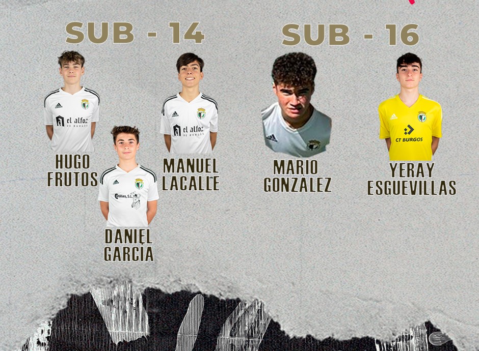 Para dicha citación, han contado con Yeray Esguevillas y Mario González, pertenecientes al Burgos CF Cadete A, en el equipo sub-16 y con Daniel García, Hugo Frutos y Manuel Lacalle, del Burgos CF Infantil A, para el sub-14.