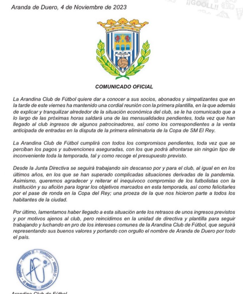 Este es el comunicado de la Arandina: