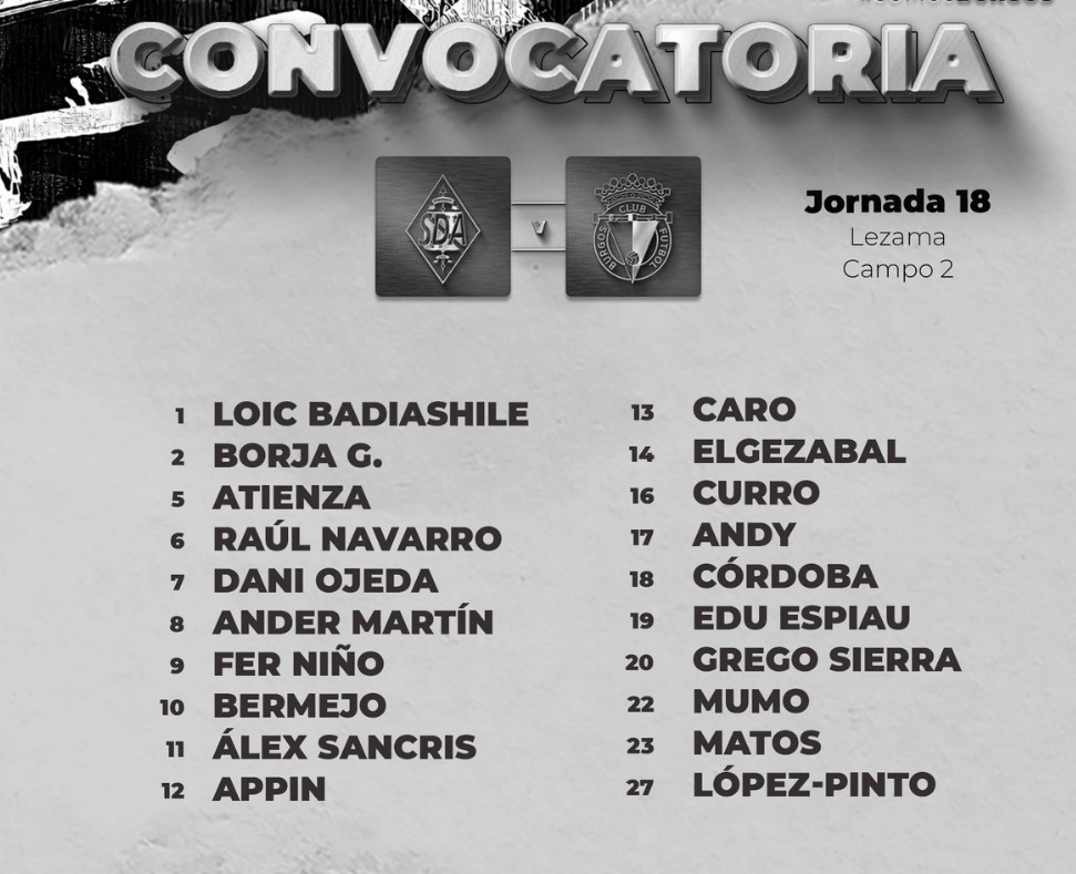 Para este partido Bolo ha citado a 20 jugadores del primer equipo: Loic Badiashile, José Antonio Caro, Borja González, Atienza, Raúl Navarro, Dani Ojeda, Ander Martín, Fer Niño, Álex Bermejo, Álex Sancris, Kévin Appin, Elgezabal, Curro, Andy, Aitor Córdoba, Edu Espiau, Grego Sierra, Mumo, José Joaquín Matos y Javi López Pinto.