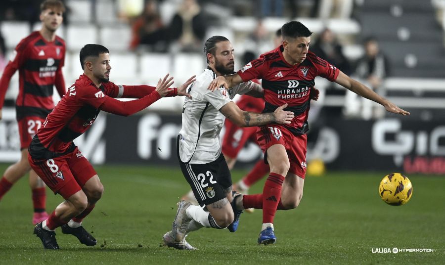 Incidencias: Partido de la Jornada 19.ª de la Segunda División Liga HyperMotion disputado en el Estadio El Plantío ante 9.948 espectadores. Entre ellos, más de 500 seguidores del CD Mirandés.