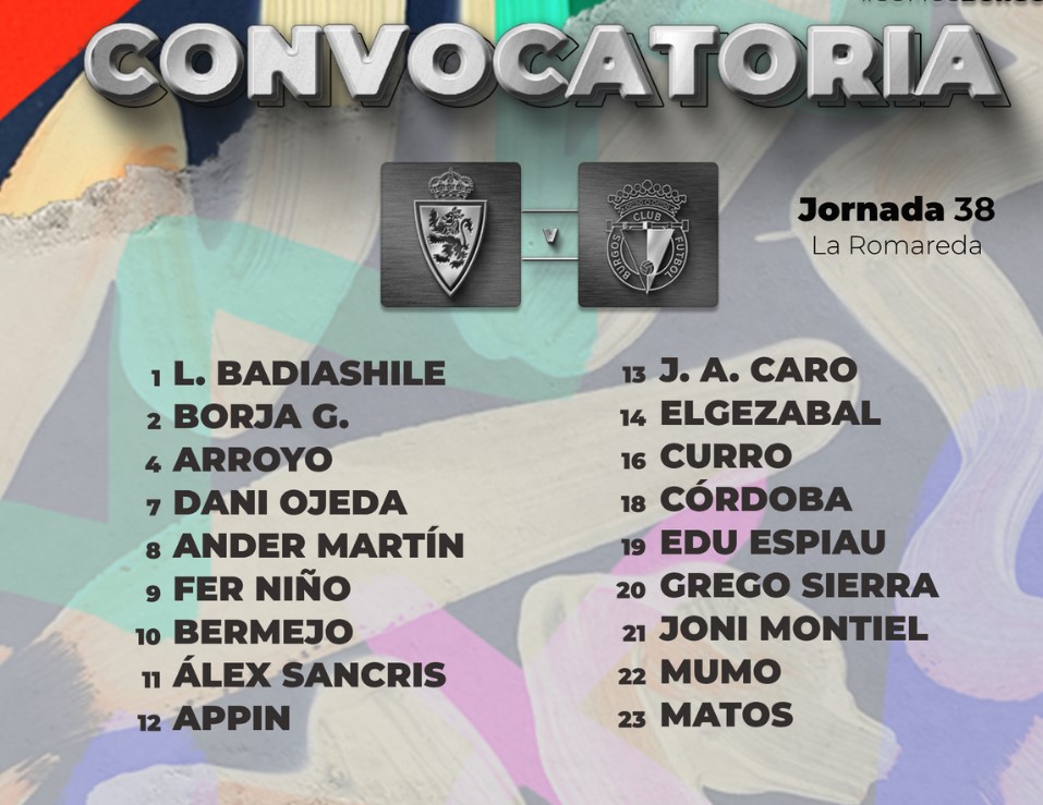 Bolo ha citado a 18 jugadores en La Romareda: Loic Badiashile, José Antonio Caro, Borja González, Anderson Arroyo, Dani Ojeda, Ander Martín, Fer Niño, Álex Bermejo, Álex Sancris, Appin, Elgezabal, Curro, Córdoba, Edu Espiau, Grego Sierra, Joni Montiel, Mumo y José Joaquín Matos.