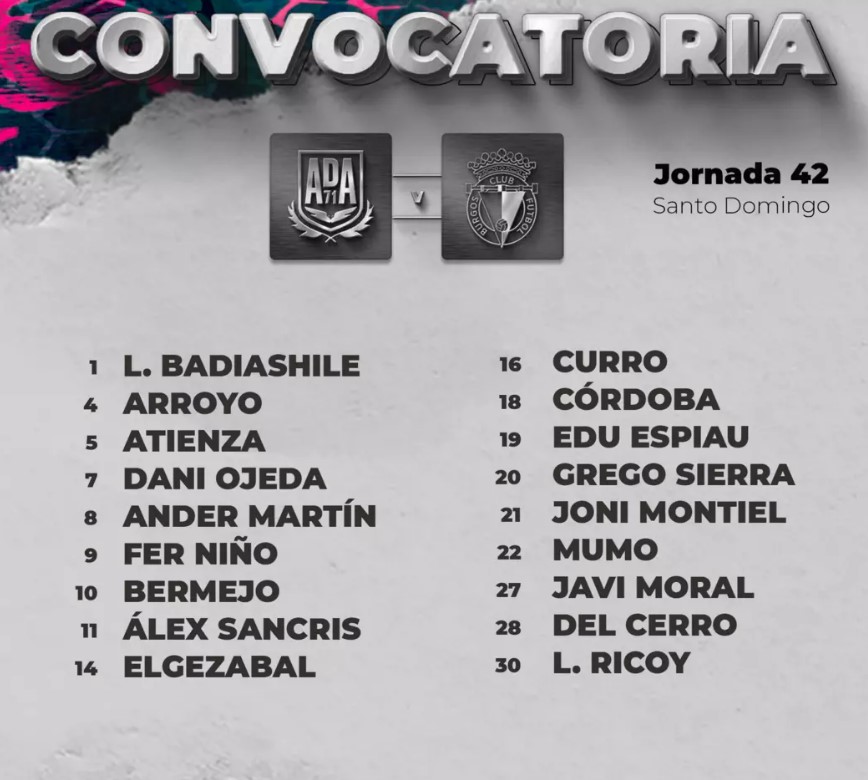 El técnico, Jon Pérez Bolo, ha convocado para este partido a 18 hombres, entre ellos Javi Moral, portero del juvenil que ha ascendido a División de Honor: Loic Badiashile, Javi Moral, Anderson Arroyo, Atienza, Dani Ojeda, Ander Martín, Fer Niño, Álex Bermejo, Álex Sancris, Elgezabal, Curro, Córdoba, Edu Espiau, Grego Sierra, Joni Montiel, Mumo, Saúl del Cerro y Lucas Ricoy.