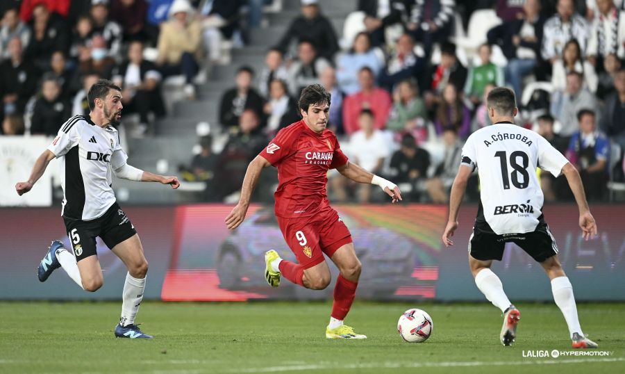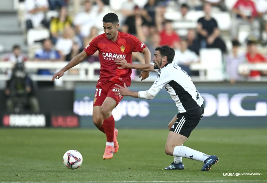 Cuando parecía llegar la primera a su fin llegó la acción que pudo desequilibrar la balanza del lado blanquinegro. En una buena combinación, Espiau era objeto de falta dentro del área y el árbitro, pese a la duda inicial, señaló la pena máxima. Curro, marcando los pasos como es habitual en él, lanzaba a su izquierda pero Poussin le adivinaba la intención. Parecía sonreír la fortuna a los locales, pues a instancias del VAR el colegiado ordenaba repetir el lanzamiento. Pero Curro cambiaba esta vez de lado el lanzamiento y el guardameta del Zaragoza volvía a adivinar la trayectoria y detener el mismo. Con el sinsabor de la jugada se llegaba al descanso del partido