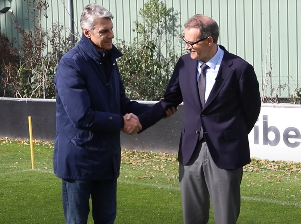 Alejandro Grandinetti, Consejero Delegado del club, y José Ángel Pérez Álvarez, Director Territorial de Ibercaja, escenificaban esta continuidad sobre el césped del campo que lleva el nombre de esta entidad amiga en la Ciudad Deportiva Burgos CF: