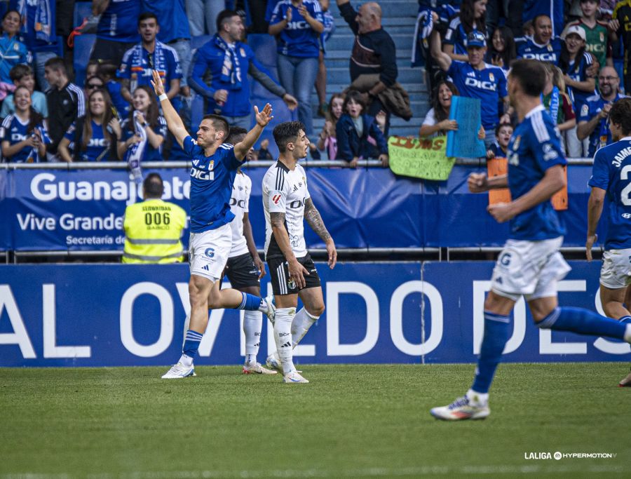 El Burgos CF estaba cómodo y llevando la iniciativa del partido, y a los 25 minutos llegó el premio al buen trabajo tras una buena triangulación que terminó en un gran centro de Borja Sánchez y el remate a bocajarro de Fer Niño para adelantar al cuadro blanquinegro en el Carlos Tartiere.