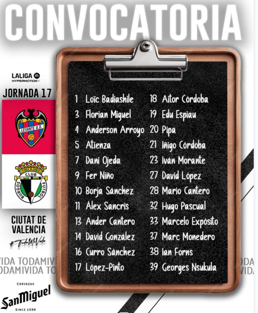 Nueva jornada y otrop reto de envergadura para el Burgos CF en Valencia donde visita la casa del Levante UD con un objetivo claro: llevarse los tres puntos de vuelta a casa. Los blanquinegros quieren confirmar sus buenas sensaciones en el último choque ante la SD Eibar y repertir la victoria para alejarse de los puestos de descenso.