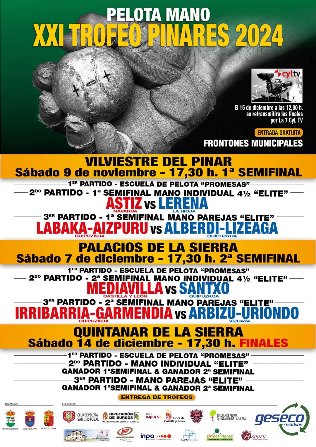 El sábado, día 7 de diciembre, a las 17:30 horas, se jugará la segunda semifinal del XXI Campeonato de Pinares de pelota en Palacios de la Sierra.