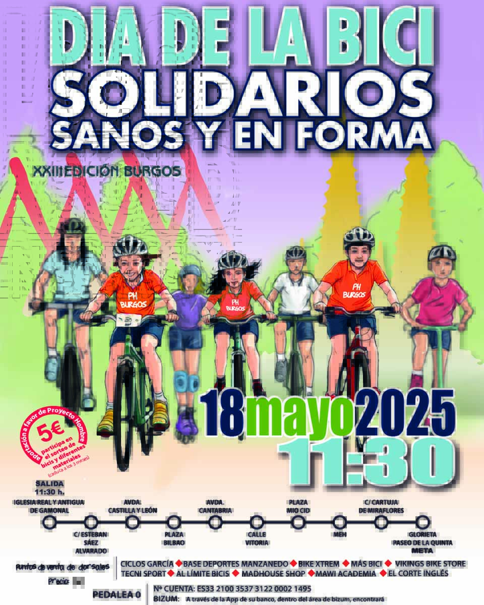 La Fundación Candeal Proyecto Hombre Burgos celebrará el próximo domingo, 18 de mayo, a las 11:30 horas, la XXIII edición del Día de la Bici, un evento consolidado en la ciudad que promueve el deporte, la vida sana y la prevención de adicciones.