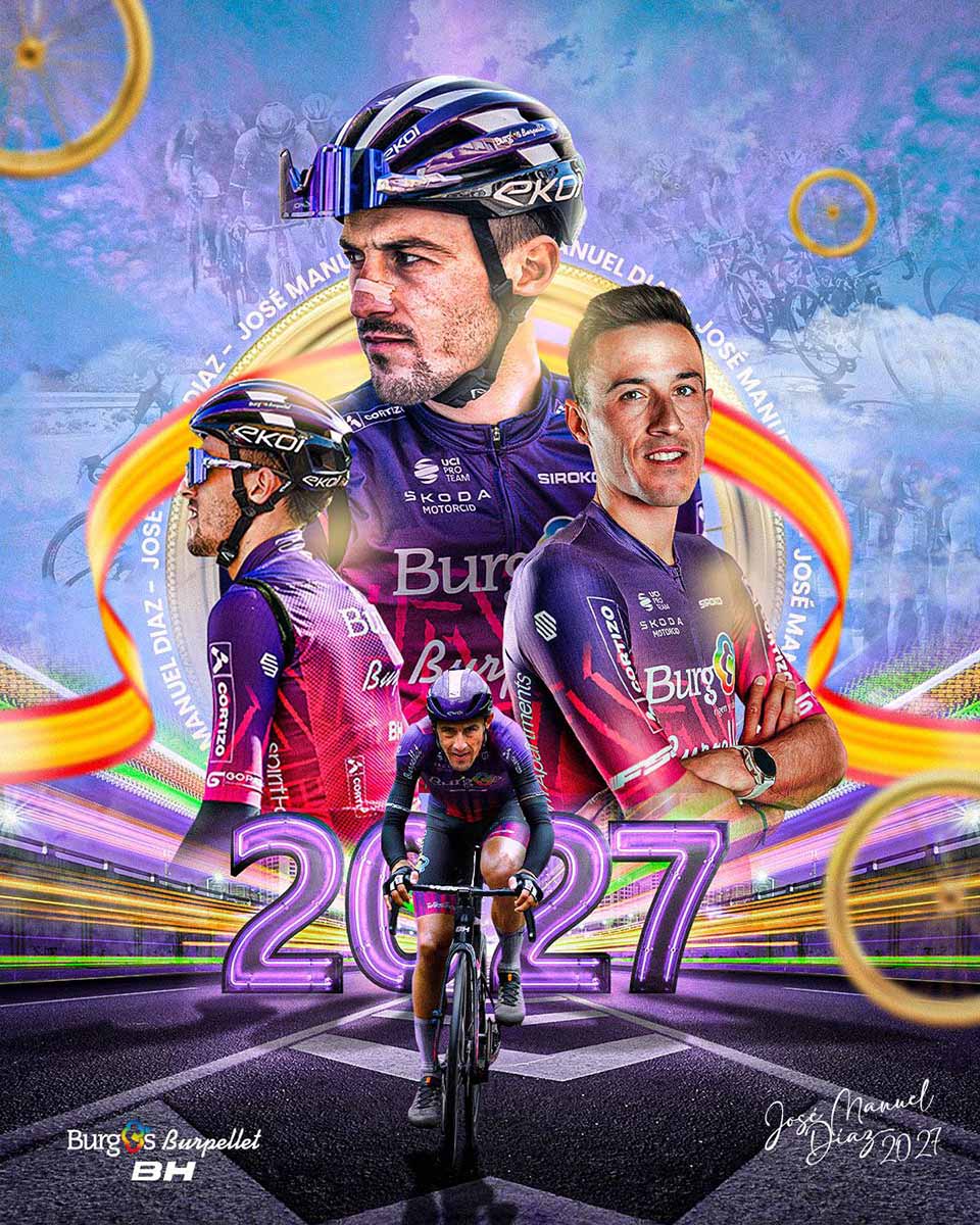 José Manuel Díaz: «Muy contento de seguir vinculado dos años más al Burgos Burpellet BH. Era algo que queríamos tanto yo como el equipo. Estoy agradecido de que la renovación se haga en estas fechas, ya que da tranquilidad para seguir rindiendo todo el año. A pesar de tener ya 30 años, que puede ser una edad mayor para mucha gente, yo me sigo sintiendo cada día mejor. Cada año doy un pasito más adelante y estoy en mis mejores números. Veo que mi función dentro del equipo se va asentando. Además de dar resultados, he cogido el rol de asesorar a jóvenes, ayudarlos y verlos crecer. Les doy consejos y ellos los aplican y eso te llena de gratitud. También ayudo al equipo a crecer lo máximo posible, transmitiendo cosas que creo que se pueden mejorar y creo que se valora mucho eso. El equipo se ha convertido en una familia para mí y ellos me ven como más que un corredor y me hacen sentir como en casa. Al final, no tengo presión de ningún tipo. Soy un ciclista responsable y profesional y ellos me dan tranquilidad, lo que me hace rendir al 100%. Esperemos seguir así y que los años que voy a continuar en el equipo siga rindiendo de la misma manera y ayudando a los jóvenes y al equipo en todo lo posible».