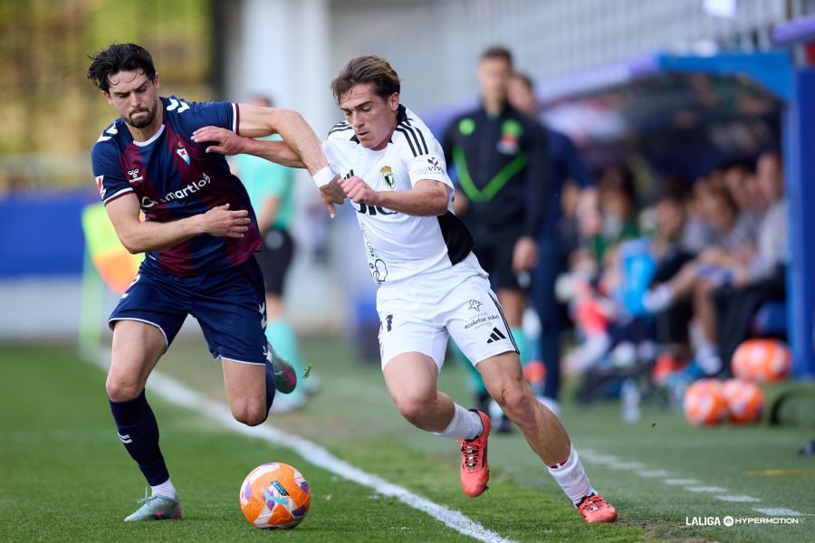 Los primeros minutos fueron de dominio burgalés, que no tuvo miedo a abrir líneas y presionar en el campo de un Eibar más conservador y que buscaba mantener el balón. La primera gran ocasión llegó a los 17 minutos en un saque de esquina que remató Cubero y empujó Antonio Puertas pero en fuera de juego.
