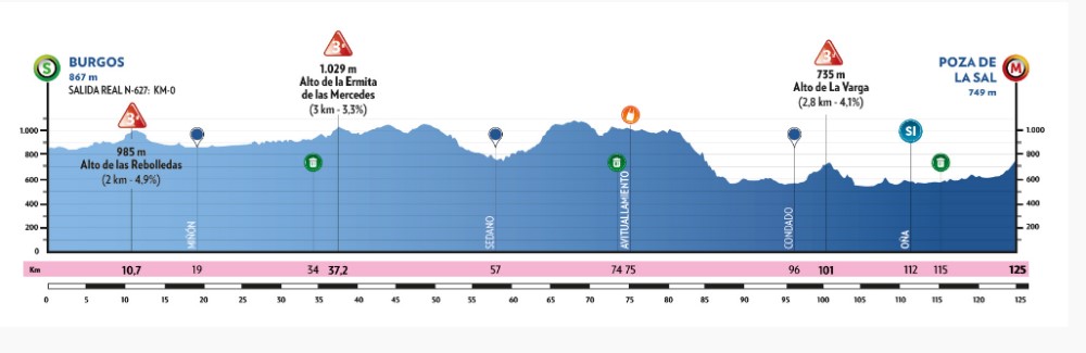 Tras el protocolario corte de cinta a los pies de la Catedral de Burgos y frente al Arco de Santa María, el pelotón dejará la capital burgalesa con salida real a las 12,37 en dirección Sotragero, Villanueva de Ubierna y Celadilla de Sotobrín para afrontar, en el kilómetro 10 de etapa, la ascensión del Alto de las Rebolledas (3ª Categoría).