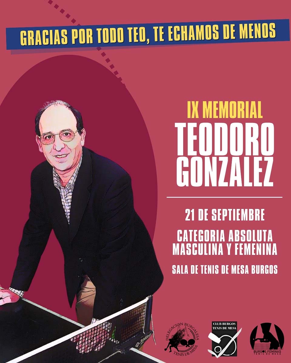 Este próximo domingo, 21 de septiembre, se celebra la IX Edición del Memorial Teodoro González, impulsor del tenis de mesa en la ciudad y provincia. La sala de tenis de mesa de Burgos será el escenario desde la 9:30 horas de una gran fiesta del tenis de mesa.