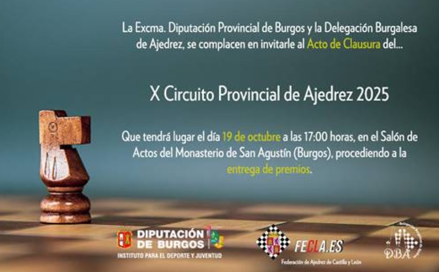 Un año más llega a su fin una edición más, en este caso la 10ª, del Circuito Burgalés de Ajedrez. La jornada de clausura del mismo tendrá lugar este domingo 19 de octubre con sesión de mañana en el Torneo de Cardeñadijo y sesión de tarde con la ceremonia de clausura y entrega de premios en el Monasterio de San Agustín de la capital burgalesa a las 17,00 h.